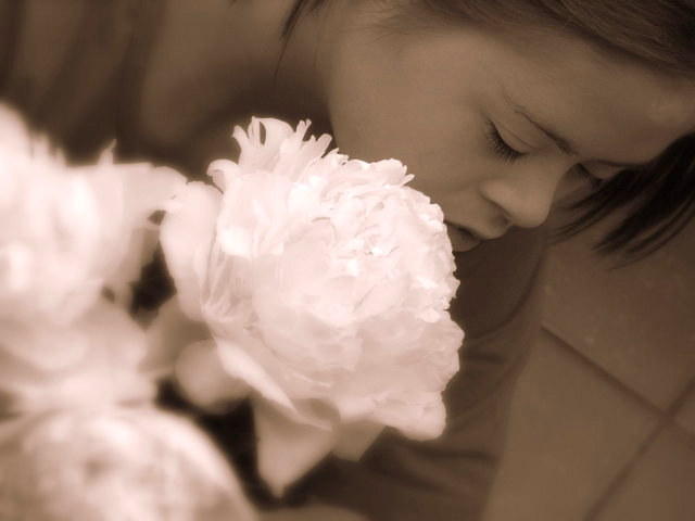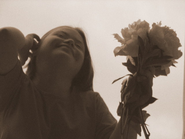 Z bukietem piwonii przed obiektywem